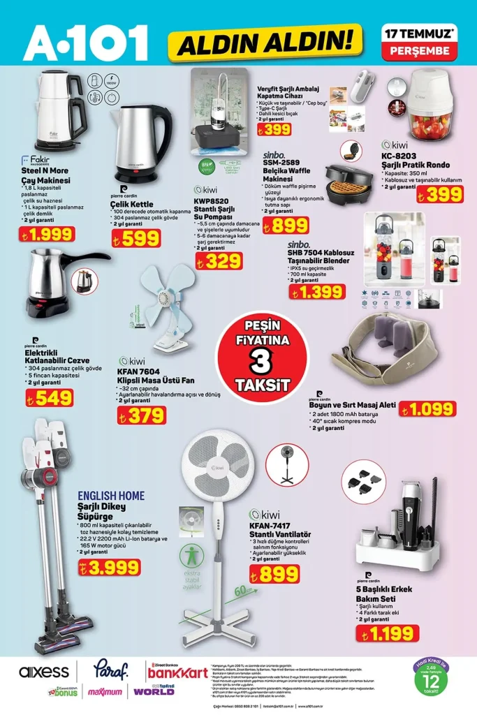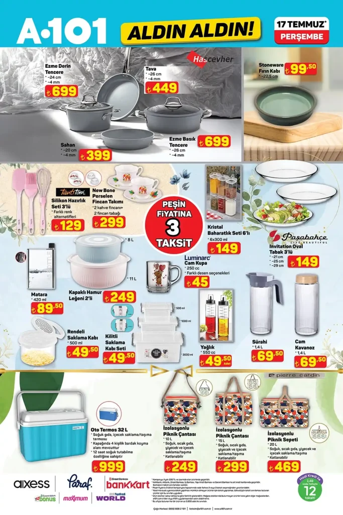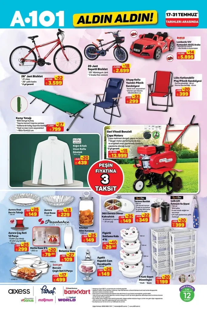 A101’in 17 Temmuz 2025 tarihli aktüel kataloğu, hem ev ihtiyacını karşılayan ürünler hem de yaz aylarına özel kamp ürünleriyle dolu. Ayrıca peşin fiyatına 3 taksit fırsatıyla bütçenizi de rahatlatıyor.