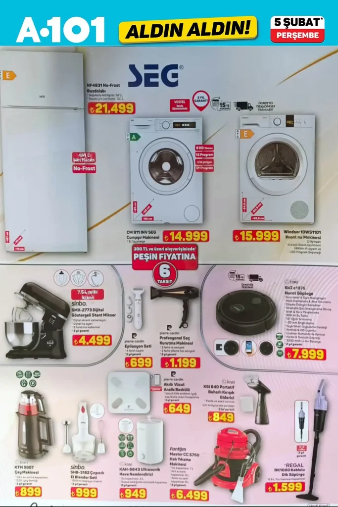 A101 5 Şubat 2026 kataloğunun ikinci sayfasında SEG markalı beyaz eşyalar öne çıkıyor. Vestel güvencesiyle sunulan ürünler, özellikle yeni ev kuranlar için avantajlı.