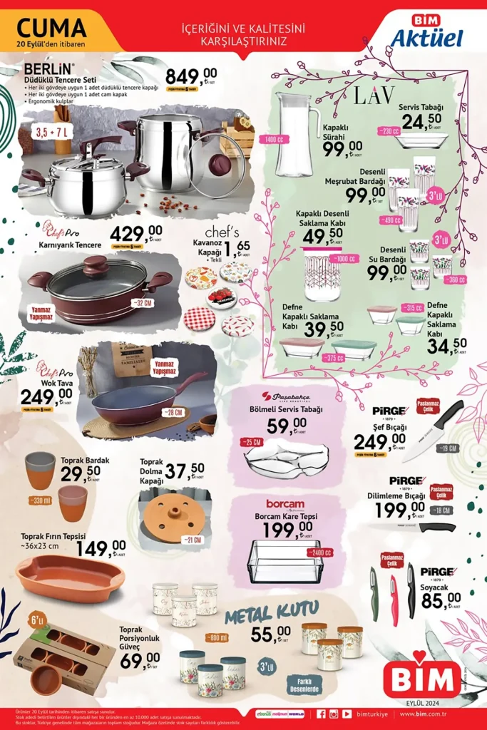 - Mutfak Ürünleri: Berlin düdüklü tencere seti (3,5L+7L) 849 TL, Chef’s Pro karnıyarık tenceresi ve wok tava gibi pek çok mutfak ürünü uygun fiyatlarıyla satışta olacak.