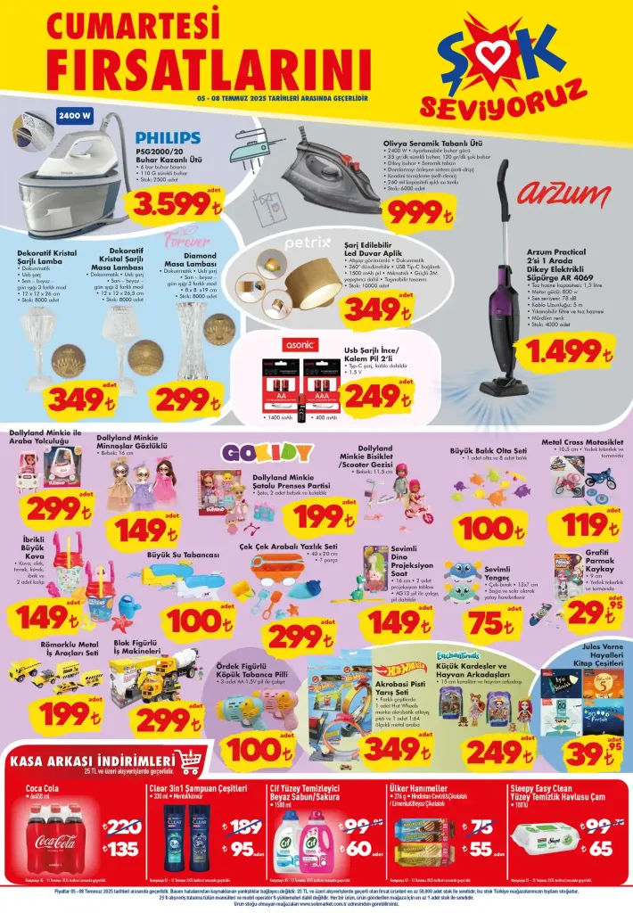 eni haftaya özel ŞOK indirimleri açıklandı! 5 Temmuz 2025 Cumartesi günü geçerli olacak ŞOK Aktüel Kataloğu, birbirinden avantajlı ürünlerle dolu. Elektrikli ev aletlerinden dekoratif ürünlere, çocuk oyuncaklarından temizlik malzemelerine kadar birçok üründe sınırlı stoklarla büyük indirimler sunuluyor.